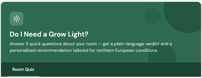 If you are new to indoor gardening, the Room Quiz is the best first step — it tells you immediately whether your space needs a grow light before you invest in anything else.