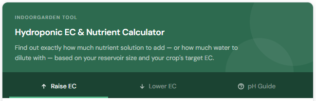 Electrical conductivity (EC) measures how much dissolved nutrient is in your water. Get it too low and plants underperform; too high and you risk nutrient burn or salt stress. This calculator helps you find the right EC target for your plant type and growth stage, then work out the correct nutrient dose for your reservoir volume. It accounts for your tap water’s baseline EC so you are dosing accurately rather than guessing.