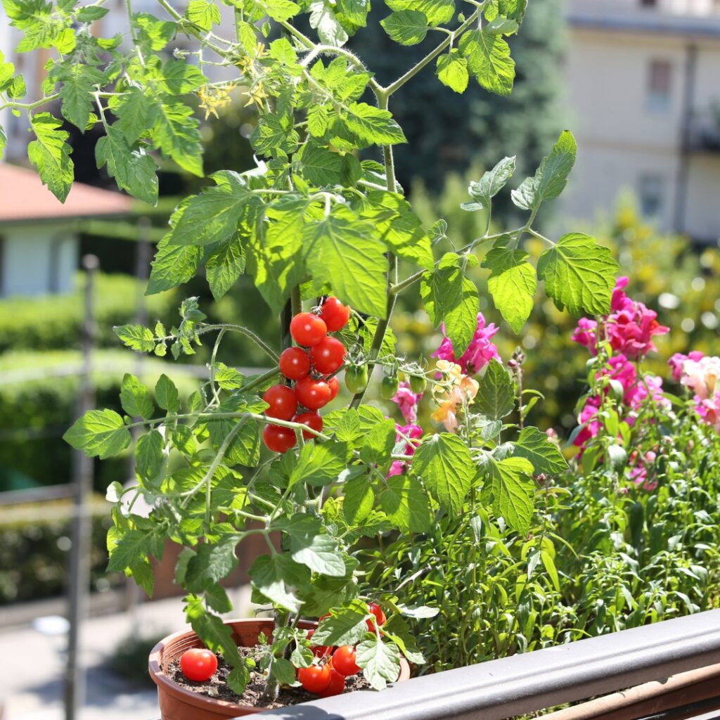 Growing a mix of lettuce and leafy greens in a vertical planter alongside a couple of compact tomato plants in larger floor containers gives you the visual structure of a proper garden — height variation, different leaf textures, colour — while keeping everything edible and productive through the growing season.